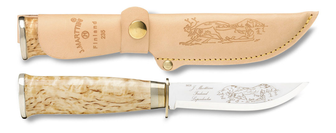 Der finnische Hersteller Marttiini präsentiert mit diesem Modell ein traditionelles Jagd- und Outdoormesser aus Lappland. Die rostfreie Klinge wird spiegelpoliert und ist mit einem hübschen Schlitten-Motiv versehen.