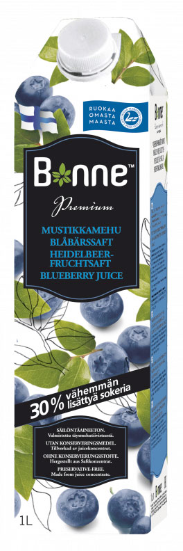 Bonne Blaubeersaft wird aus reinem Blaubeersaftkonzentrat und Quellwasser aus der Lähteenlohko-Quelle in Lohjanharju, Finnland, hergestellt. Enthält keine Konservierungsstoffe und wird mit 30% weniger Zucker gesüßt, als vergleichbare Säfte.