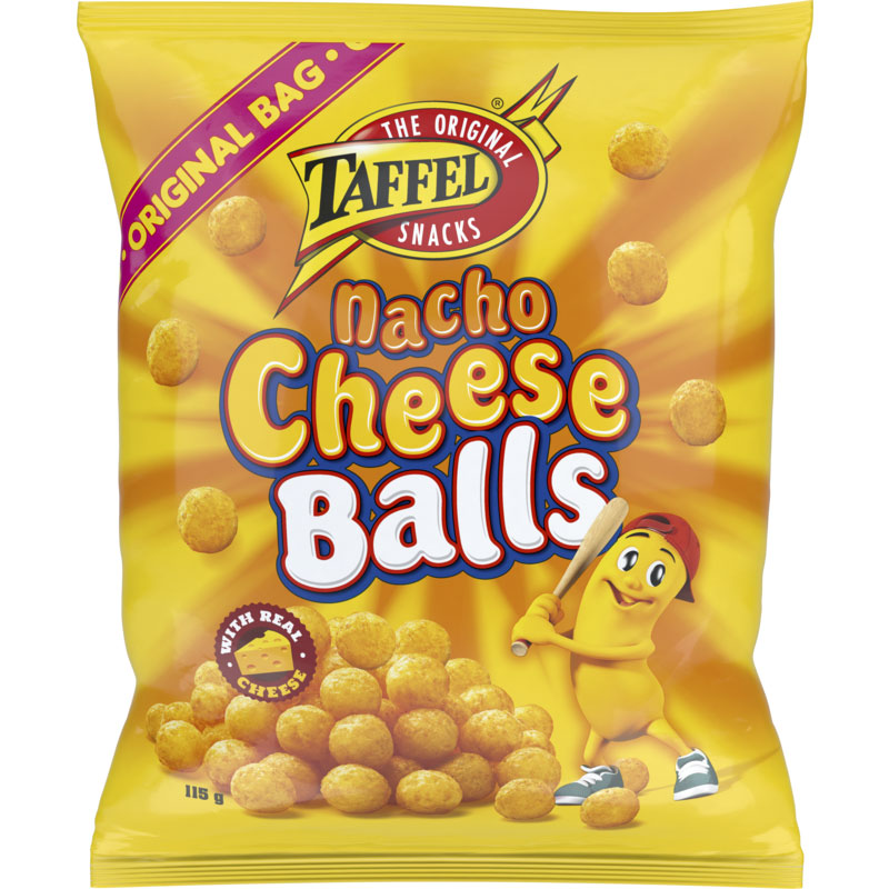 Mit Nacho-Gewürzen glasierte Käsebällchen drehen sich über der Zunge und den Geschmacksknospen. Die Bällchen sind passend zum Geschmack und der knusprigen Textur von echtem Käse.