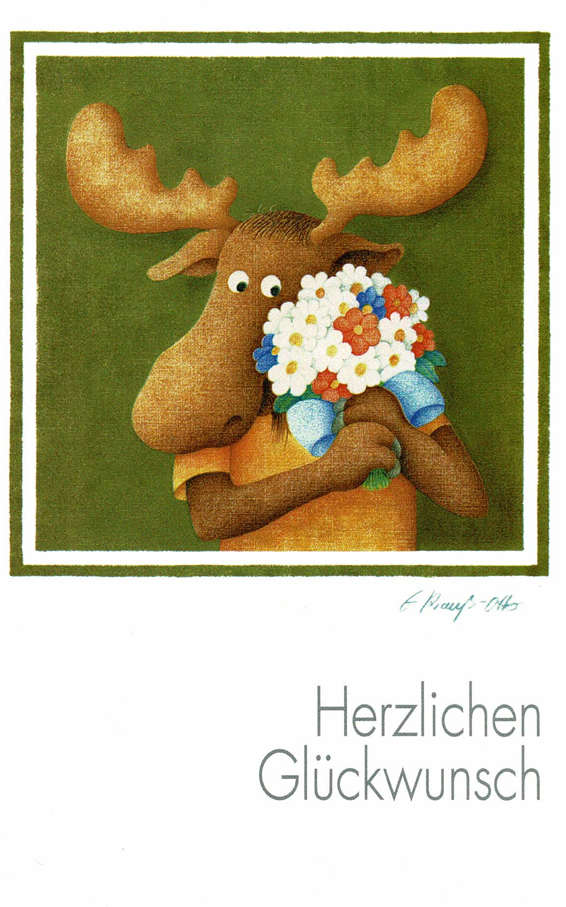 Elch mit Blumenstrauß und dem Schriftzug "Herzlichen Glückwunsch"