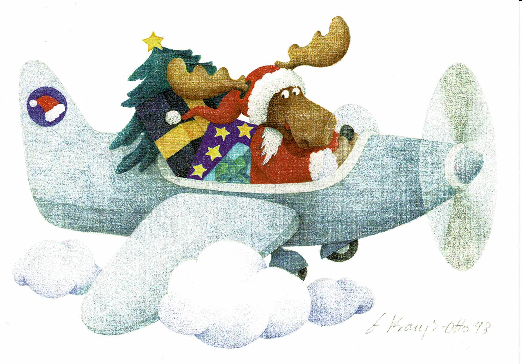 Postkarte Erik der Elch im Flugzeug mit Weihnachtsgeschenken