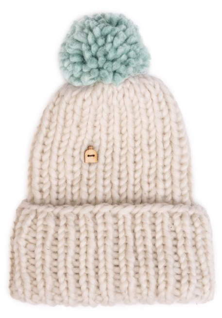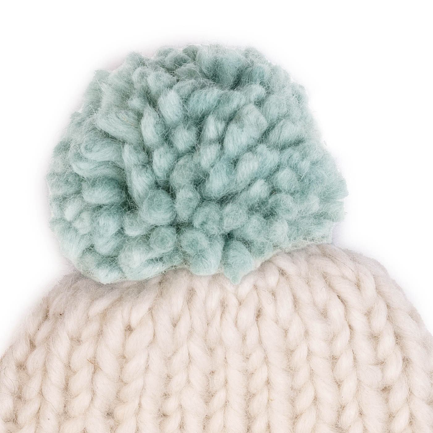 Diese naturweiße Elokuva Kultti Bommelmütze wird von den Myssy Omas in Pöytyä, Finnland, aus 100 % organischer Finnschafwolle handgestrickt. Die Mütze ist mit einem minzfarbenen Bommel verziert.