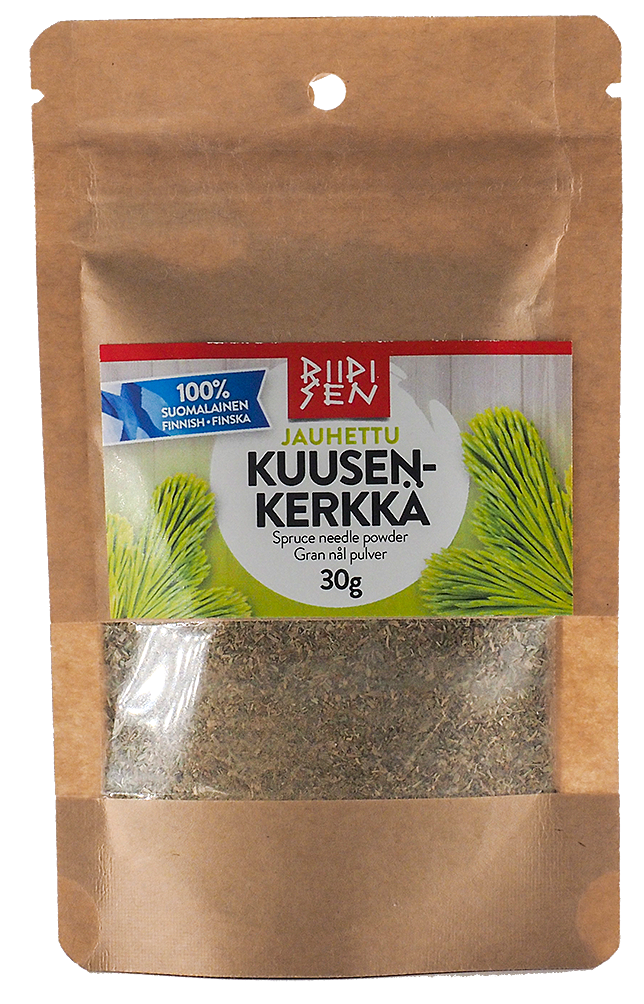 Riipisen Jauhettu Kuusenkerkkä Pulver wird aus getrockneten finnischen Fichtennadelspitzen hergestellt. Fichtennadeln enthalten reichlich antioxidative Flavonoide, Kalzium, Magnesium, Vitamin C, eine Vitamin-A-Vorstufe und Kalium.