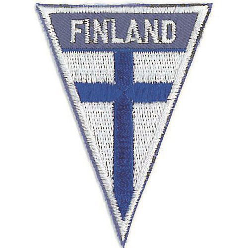 Gestickter Wimpel zum Aufnähen an Jacken, Pullover, etc. in Dreiecksform mit Schriftzug "Finland".