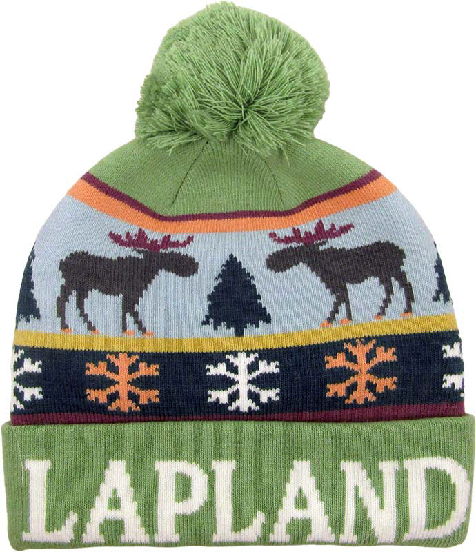 Sehr schöne und wärmende Strickmütze mit Elch Schneeflocken und "Lapland"-Schriftzug auf der Vorderseite. Krönender Abschluß ist ein Wollbommel oben auf der Mütze.