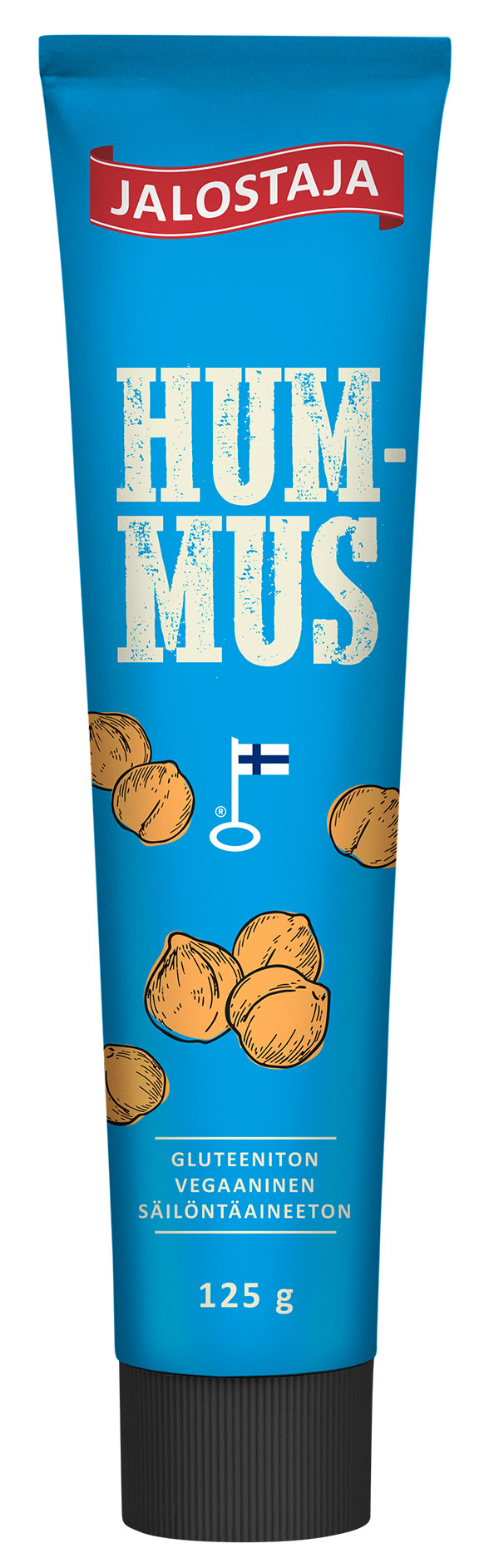 Der vielseitige Hummus von Jalostaja, der in Finnland hergestellt wird, ist in Tuben verpackt und ungeöffnet bei Zimmertemperatur lange haltbar.