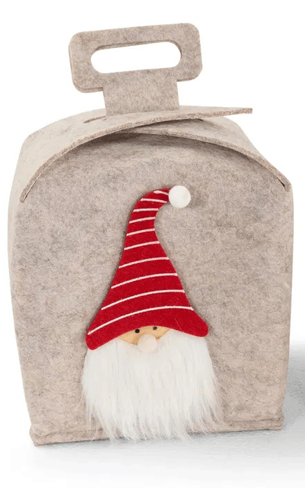 Geschenkbox aus Filz mit Wichtel und gestrichelter Mütze