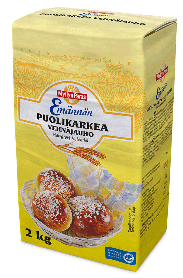 Myllyn Paras Emännän Puolikarkea Halbgrobes Weizenmehl wird aus dem Kernstück des Weizenkorns hergestellt. Halbgrobes Weizenmehl ist feiner gemahlen als Spezialweizenmehl und eignet sich gut für Brötchen, helles Brot und Semmeln, aber auch als Allzweckmehl für alle Backwaren.