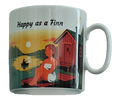 Dazu passt dieser Kaffeebecher mit dem wunderschönen Motiv einer Frau vor der Sauna in der Mitternachtssonne.