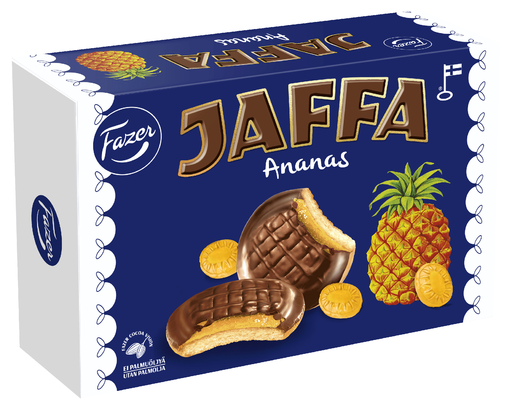 In diesen Fazer-Keksen treffen zwei Klassiker aufeinander: der Jaffa-Keks und die Marmeladenfüllung mit Ananasgeschmack. Die Lieblingskekse der ganzen Familie schmecken sowohl im Alltag als auch zu festlichen Anlässen.
