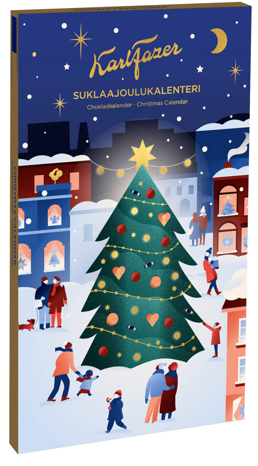 Heutzutage gehört ein Weihnachtskalender wesentlich zu den finnischen Weihnachtstraditionen. Der erste Schokoladekalender hat Fazer in den 1980er Jahren vorgestellt und er ist heute nicht mehr wegzudenken aus der Vorweihnachtszeit. Hinter den Türen des prachtvollen Karl Fazer Weihnachtskalenders finden Sie eine traumhafte Mischung aus köstlichen Pralinen für viele Geschmäcker. Das letzte Türchen ist voller Sininen Schokolade.